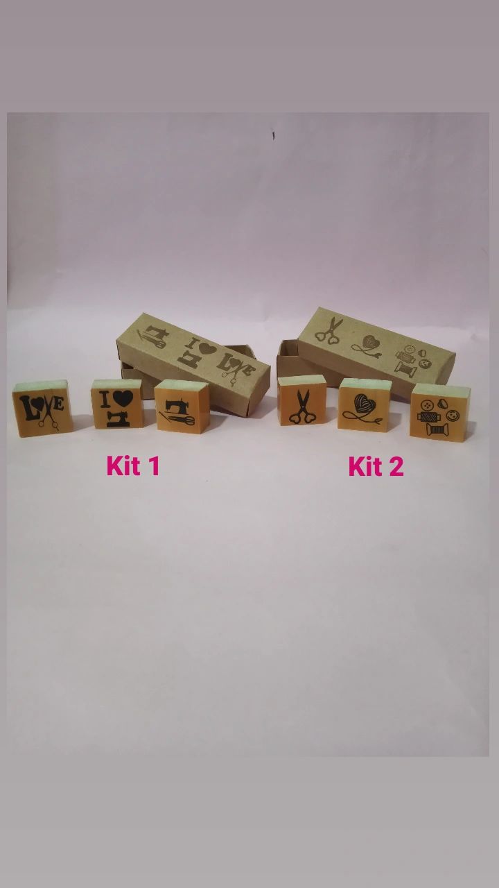 Kit com 3 mini carimbos medindo até 2,5cm de largura e a altura proporcional ao desenho + caixinha kraft para armazená-los.