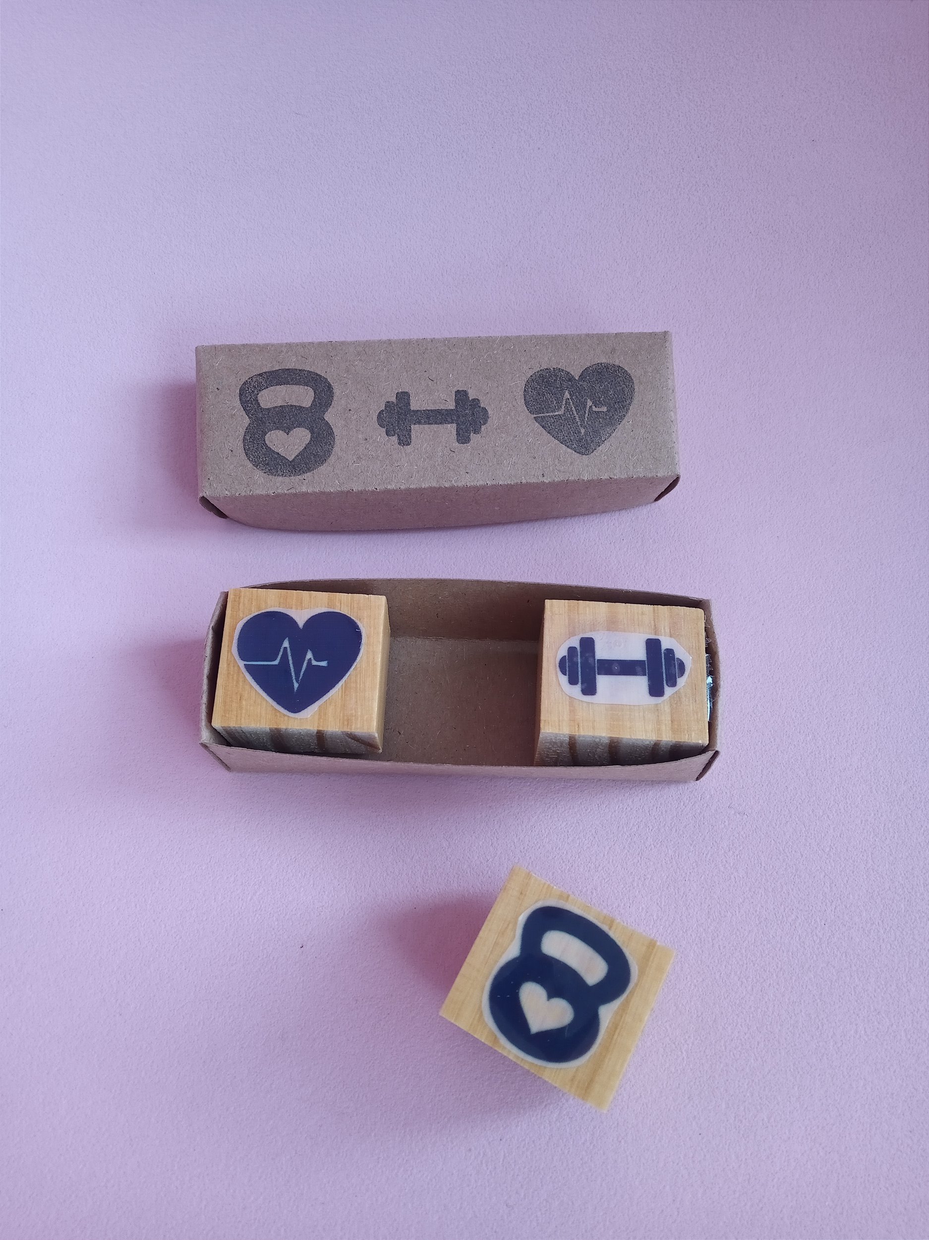 Kit com 3 mini carimbos medindo até 2,5cm de largura e a altura proporcional ao desenho + caixinha kraft para armazená-los.