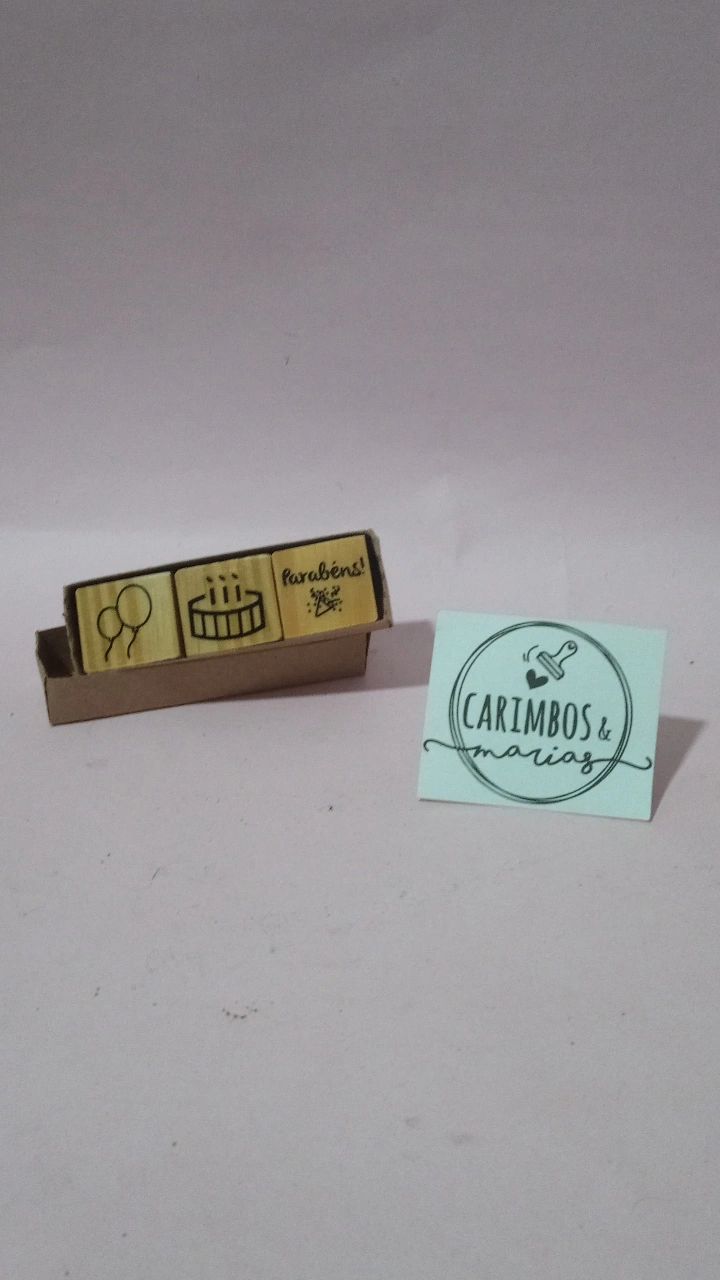 Kit com 3 mini carimbos medindo até 2,5cm de largura e a altura proporcional ao desenho + caixinha kraft para armazená-los.