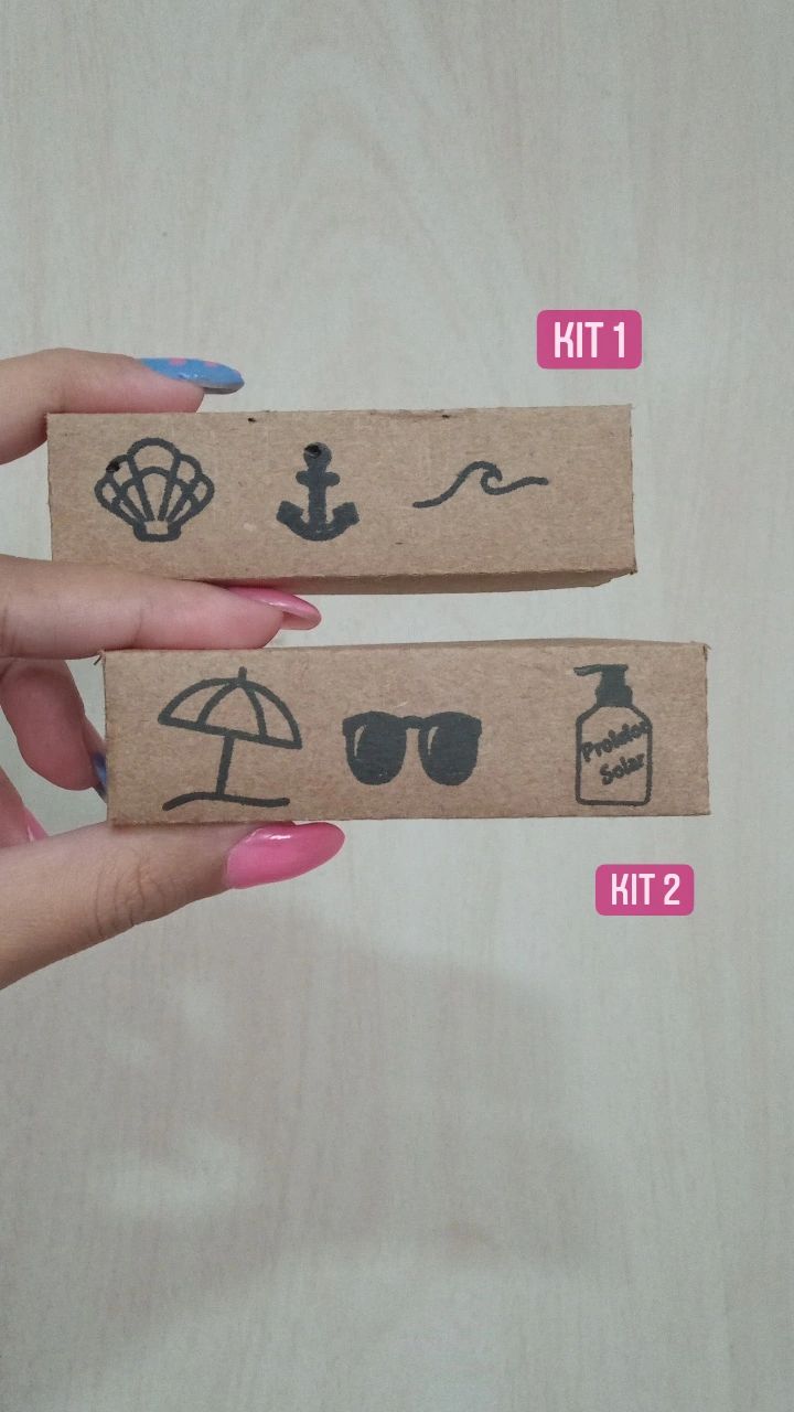 Kit com 3 mini carimbos medindo até 2,5cm de largura e a altura proporcional ao desenho + caixinha kraft para armazená-los.
