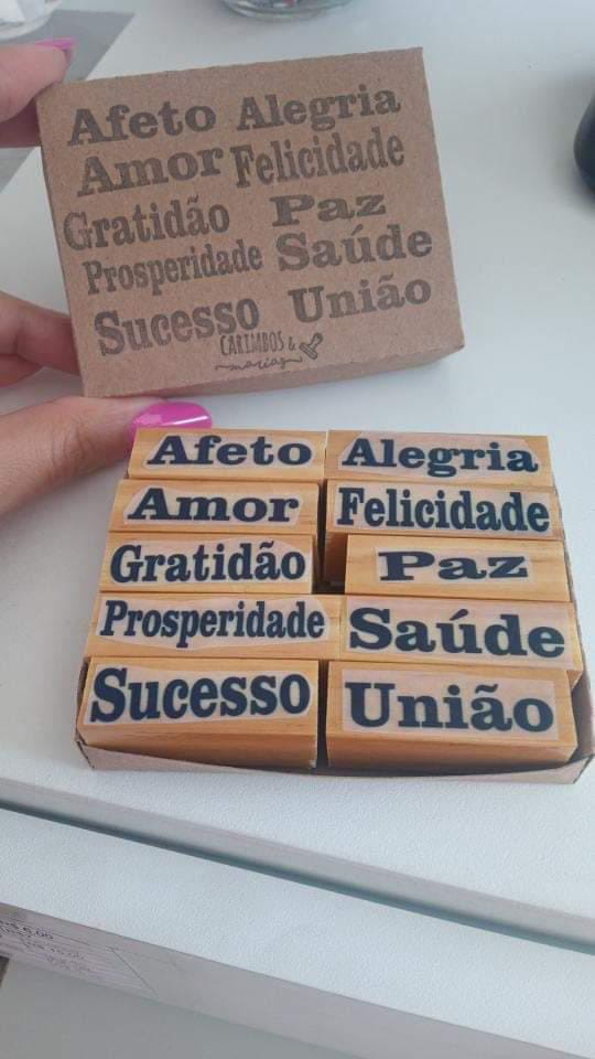 Kit com 10 carimbos medindo mais ou menos 1x4cm de altura e largura  + caixinha kraft para armazená-los.